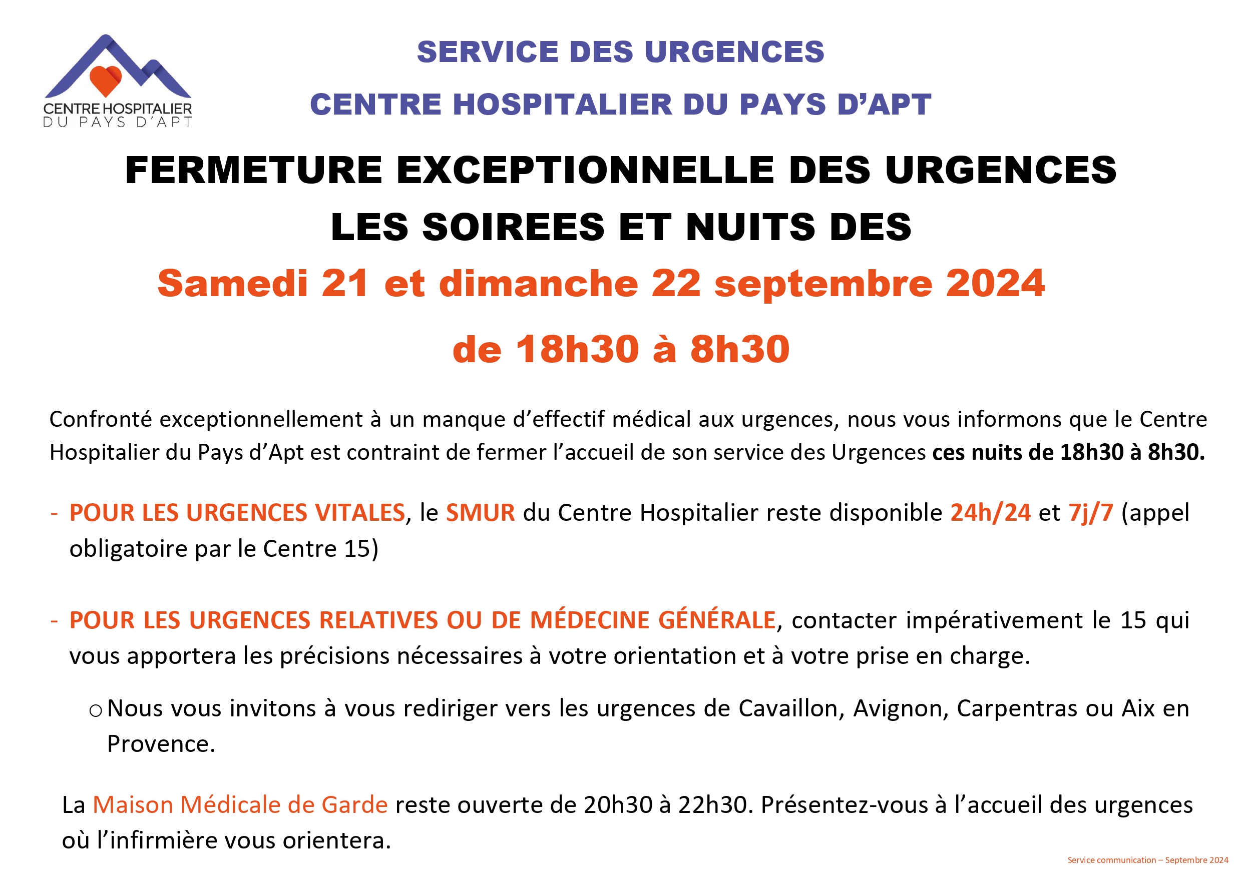 Fermeture exceptionnelle des Urgences les nuits des 21 et 22 septembre 2024