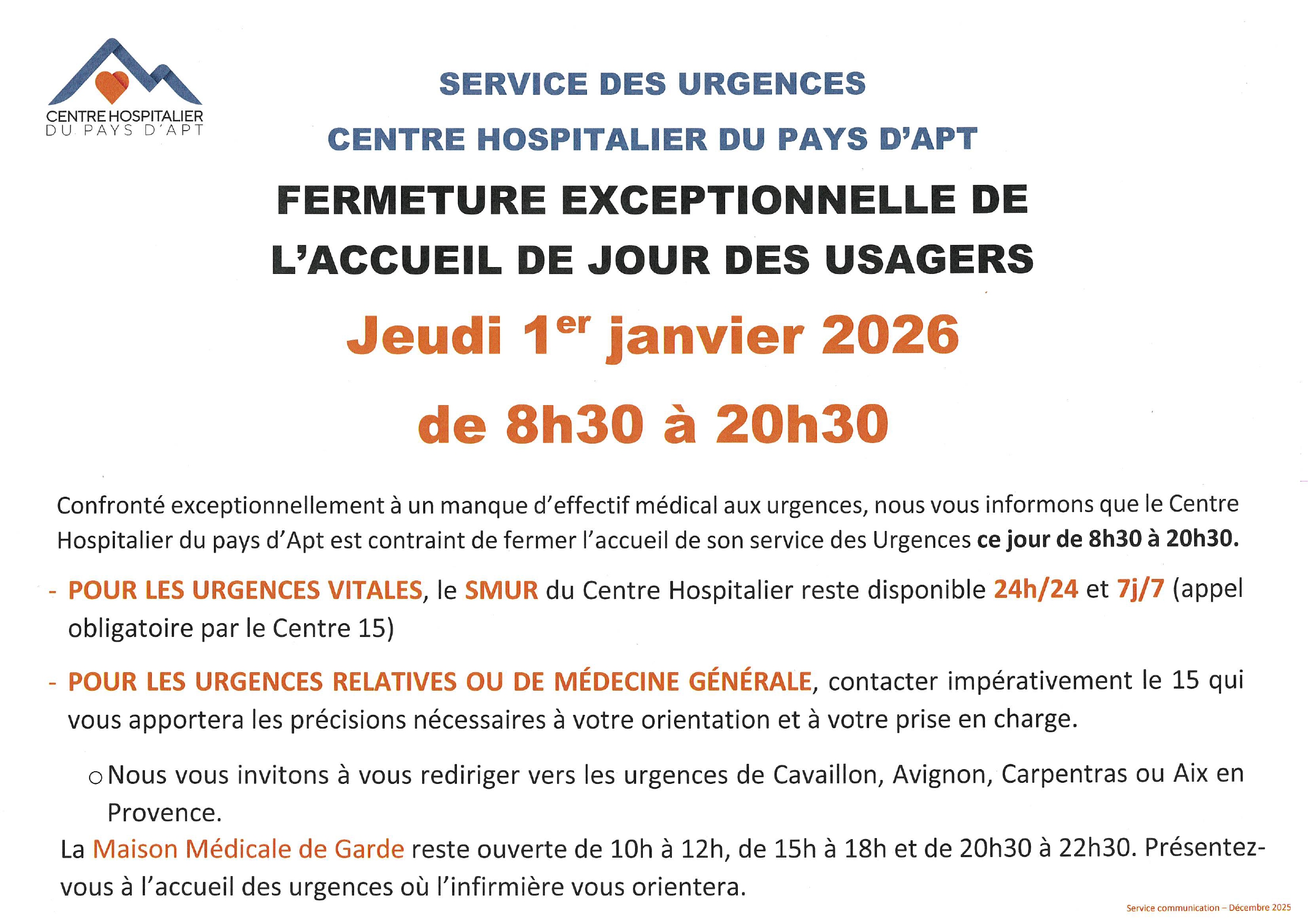 Fermeture exceptionnelle des Urgences JEUDI 1er JANVIER 2026