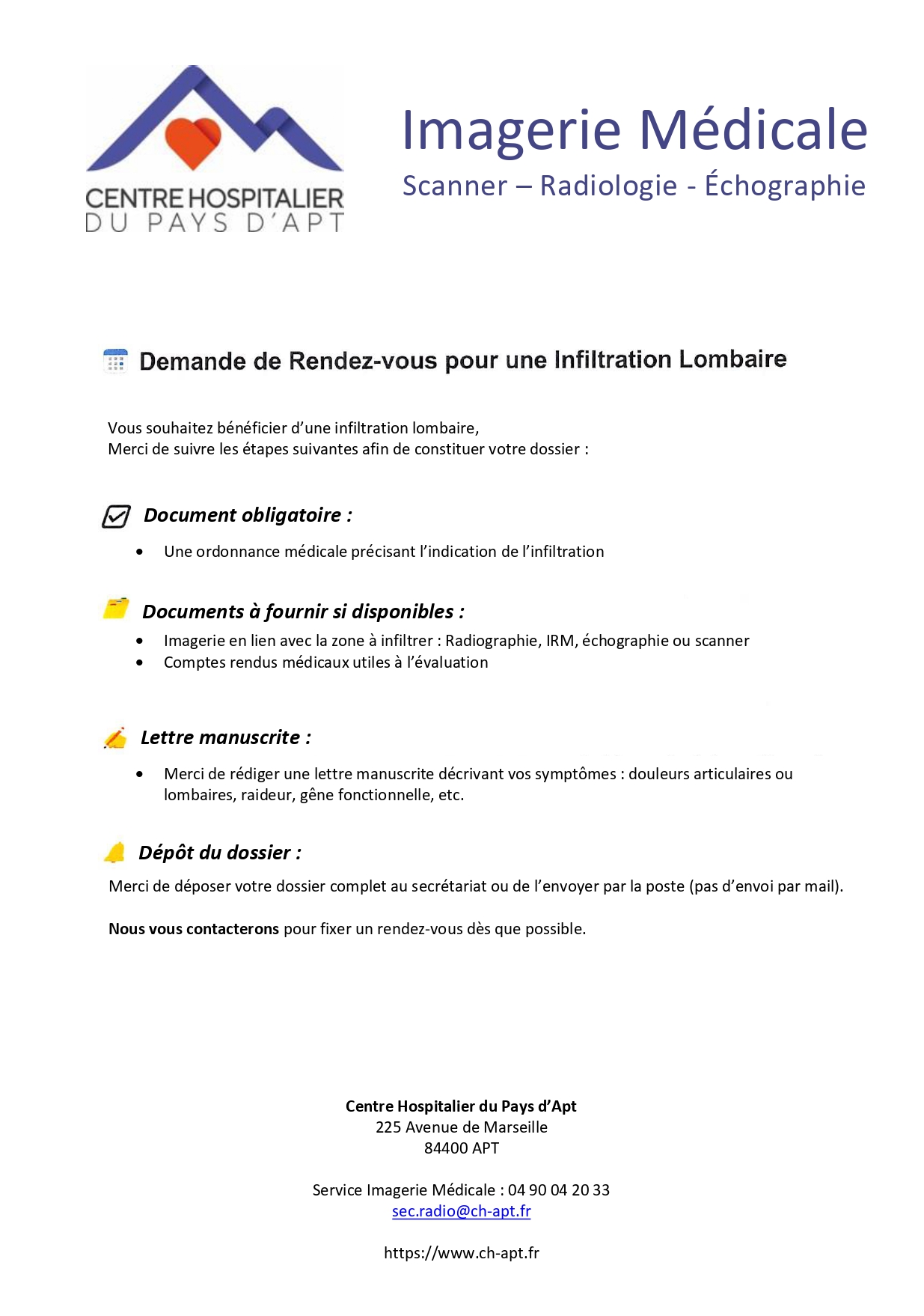 Pour toute demande d’infiltration lombaire, un dossier complet doit être constitué avant la prise de rendez-vous.